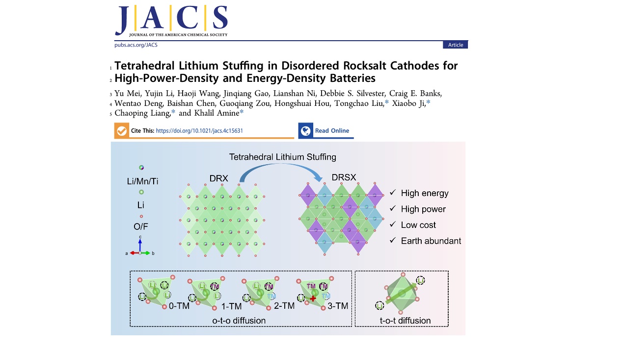 近日,公司纪效波教授团队在化学类顶级期刊《美国化学会志》(Journal of the American Chemical Society)发表了题为“四面体锂填充无序岩盐正极用于高功率密度和能量密度电池(Tetrahedral Lithium Stuffing in Disordered Rocksalt Cathodes for High-Power-Density and Energy-Density Batteries)”的研究论文。伟德victor1946官网登录为第一单位,纪效波教授为通讯作者,2020级博士生梅雨为第一作者
