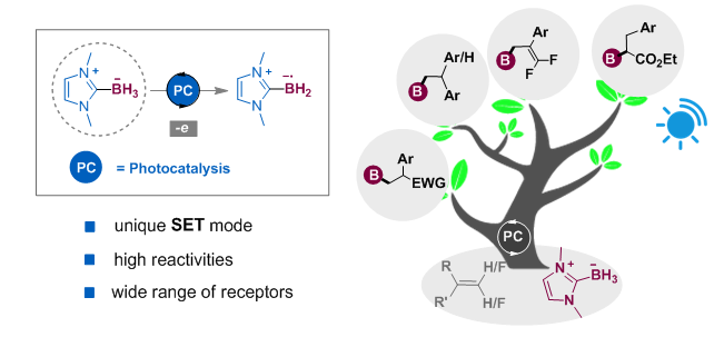 工业界一直追求的目标。鉴于此,阳华教授研究团队以氮杂卡宾硼烷为新型硼化试剂,以可见光作为清洁能源,首次实现了可见光诱导下的氮杂卡宾硼烷B-H键直接氧化断裂;开发了一种合成了二氟烯烃硼化物和α/β-羰基硼化物的新方法。该方法绿色高效、反应条件温和、底物普适性好,为有机硼化合物的绿色合成提供了新的思路,具有广阔的应用前景。