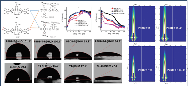 近期,有机太阳能电池材料方面的工作主要集中在开发具有良好吸收的近红外A-DA’D-A型非富勒烯受体。其中,较为常用的设计策略是将强吸电子氟原子引入A-DA’D-A型非富勒烯受体的端基,从而可有效提升分子内电荷转移效应(ICT)。然而,氟原子引入势必会增加目标分子的电子亲和势,导致与聚合物给体能级不匹配;并且会改变给/受体分子间相互作用力从而影响活性层的形貌。因此,要综合考虑拓宽吸收、活性层形貌以及能级匹配,合理地选择含氟给/受体的组合,从而制备高效有机太阳能电池。