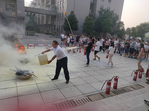 在安全疏散环节,全体研究生新生在吴教官的指挥下,井然有序地撤离到了安全地带,随后在场的老师们并对灭火器的构造及使用方法进行了现场实践教学。