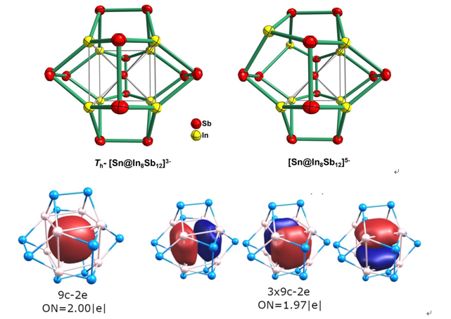 在Angew. Chem. Int. Ed.期刊上报道了一例具有罕见Th对称性的全金属团簇[Sb@In8Sb12]3-的合成。该团簇结构是单个Sb原子内嵌在一个五角十二面体的In8Sb12笼中,八个In位点向内凹陷直接与Sb成键,是固相中首例具有Th对称性无配体保护的全金属团簇。单晶结构辅以理论计算表明,高度对称的[Sb@In8Sb12]3-与其两电子还原化合物[Sb@In8Sb12]5-以1:1比例共存,后者两个毗邻的In位点往外突出到与三个Sb共平面位置,同时也使得团簇整体以“[Sb@In8Sb12]4-”平均形式出现。AdNDP成键分析表明Sb@In8立方笼内存在着4个9c-2e的全离域键,8个离域电子满足2(N+1)2的球芳香性判据,体系中球芳香性对稳定团簇起着关键作用。