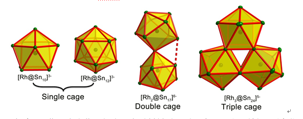 采用模板剂诱导合成方法,逐步组装合成了系列不同尺寸的内嵌Rh的全金属Sn簇,包括单金属内嵌[Rh@Sn10]3?和[Rh@Sn12]3?,双金属内嵌[Rh2@Sn17]6?,及首例三金属内嵌十四族簇[Rh3@Sn24]5–。后者也是目前从溶液中分离得到最大的内嵌型十四族金属团簇。该工作发表在最新一期的Chem. Sci上,并被选为封面论文(Chem. Sci., 2019,10, 4394-4401)。此外,刘超副教授今年来还发表了一篇综述文章,详细地从合成方法、团簇结构类型、成键特征及规律等方面总结了全金属团簇的最新研究进展(Coord. Chem. Rev. 2019, 382, 32-56)