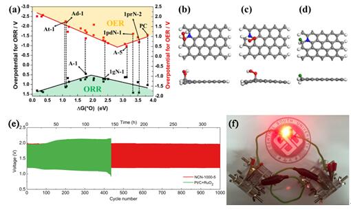 鉴于此,李洁教授小组采用自发气泡发泡策略合成了一种氮掺杂的超薄碳纳米片。这种具有超薄片状结构、超高比表面积(1793 m2g-1)和丰富边缘缺陷的碳纳米片在ORR、OER和HER过程均展现出优异的催化性能和长期稳定性。同步辐射X射线吸收精细结构谱(NEXAFS)等实验结果和密度泛函理论计算揭示,位于Armchair型石墨烯结构边缘缺陷处且与石墨N相邻的碳原子(A-1构型)为ORR、OER和HER的活性位点。组装成可充放电锌-空气电池后,该种超薄碳纳米片催化剂展现出高的能量密度(806 Wh kg-1)、低的充/放电压平台差(0.77 V)和超长的循环寿命(>330 h)。该研究为制备具有独特结构和高比表面积的先进碳材料提供了一种通用方法,也为设计和开发与能源相关的电化学反应多功能催化材料提供了新思路。