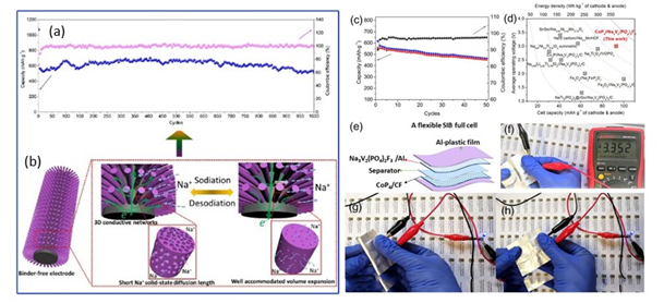 钠离子电池由于成本低廉在大规模储能领域具有良好的应用前景,是目前的研究热点之一。开发低成本,具有高能量密度和长循环寿命的新型负极材料是构建高性能钠离子电池的关键。金属磷化物因具有理论容量高,成本低廉等优点是较有前景的一类负极材料。然而,其较低的固相离子扩散速率及充放电过程巨大的体积膨胀使得该类材料循环寿命差且倍率性能不佳。鉴于此,团队从电极结构设计的角度出发报道了一种新型自支撑介孔金属磷化物阵列@碳毡(CF)复合电极,该电极具有如下优势: 1) 丰富的介孔结构不仅可克服循环过程中材料的体积膨胀,同时有利于电解液与电极的充分接触;2)活性物质一次粒子尺寸仅~10nm,可极大地缩短钠离子在固相中的扩散距离; 3) 三维导电网络结构有利于电子的快速传输,促进嵌钠电化学反应;4)自支撑结构可避免电解液与添加剂(如导电剂,粘结剂等)之间的副反应。作者制备了包括微米线,立方体和纳米片在内的三种不同形貌的介孔金属磷化物阵列@碳毡复合电极(CoP4/CF,FeP4/CF,NiPx/CF),电化学测试结果显示,该类介孔阵列电极具有优异的倍率性能和超长的循环寿命,在1000次循环后的容量保持率仍超过90%。作者组装了扣式CoP4/CF//Na3V2(PO4)2F3钠离子全电池,能量密度高达280 Wh/kg,同时组装了柔性软包电池,显示了优异的机械性能,该复合电极在柔性钠离子电池领域具有良好的应用前景。该工作初步解决了金属磷化物循环寿命短的问题,也为新型钠离子电池高容量负极的设计提供了一种新思路。