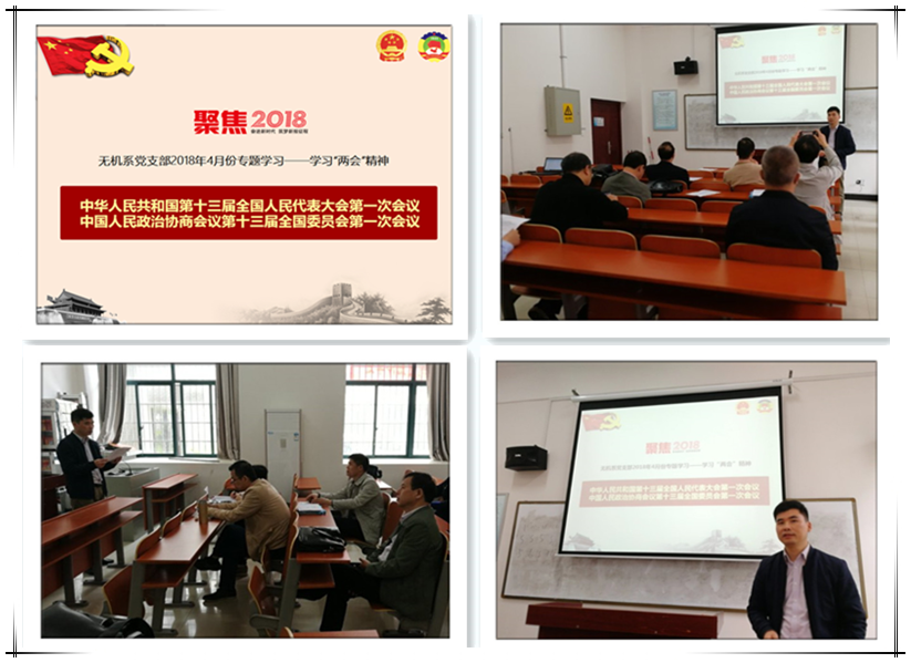 4月25日上午,无机化学系党支部在化学楼123教室召开组织生活会,专题学习贯彻2018年全国“两会”精神。会议由支部书记张寿春同志主持,支部全体党员参加。