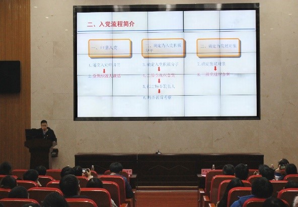 仪式在国歌声中拉开了序幕。首先,同学们一起观看了中央党校公开课“中国共产党的文化和使命”。“中国共产党的理论,并不是高高在上的政治话语,它跟我们每个人的生活息息相关。”——中央党校文史教研部副教授林雅华老师用简单有力的语言告诉我们,中国共产党是一个有信念、有信仰、有信心的政党,才使得中国在这40多年的改革开放的过程中,创造了世界瞩目的成就。