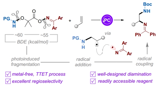 邻二胺结构单元广泛存在于生物活性化合物、药物分子以及催化剂分子结构中,在合成化学、药物化学、生命科学等领域都有非常重要的应用。然而,现有的双胺化试剂往往需要使用重金属催化剂或大量的氧化剂,且存在区域选择性不理想和底物适用性局限等问题。如何在无金属/氧化剂参与的条件下,环境友好、简单高效地构建邻二胺骨架是学术界和工业界一直追求的目标。鉴于此,阳华教授研究团队以计算化学为指导,设计开发了一种性能优异的新型双胺化试剂,首次将能量转移策略应用于烯烃的可见光催化双胺化过程中;该方法具有合成简便、选择性高、适用范围广、反应条件温和和环境友好等优点,为邻二胺类化合物的绿色合成提供了新的思路,具有广阔的应用前景。