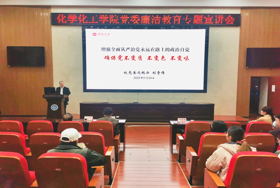 为进一步贯彻中共中央办公厅《关于加强新时代廉洁文化建设的意见》,落实公司纪委“六个一”工作思路和举措,营造风清气正的公司氛围。11月24日上午,伟德victor1946官网登录党委巡视办主任刘奇伟在伟德victor1946官网登录133报告厅作了题为“增强全面从严治党永远在路上的政治自觉,确保党不变质、不变色、不变味”的廉洁教育专题宣讲,伟德victor1946官网登录党政班子成员,中层干部、办公室行政人员、教职工党员参加。会议由伟德victor1946官网登录党委书记、纪检委员刘有才主持。