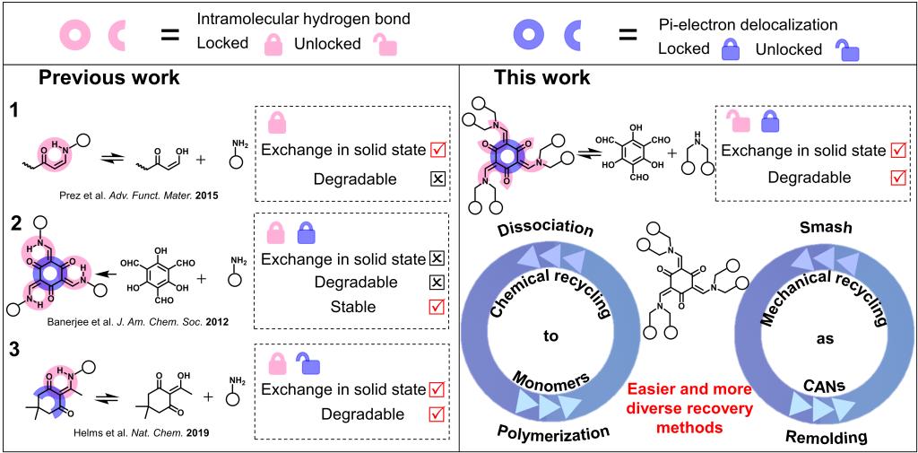 交联型网状聚合物由于具有永久交联的共价网络,难溶解难熔融,往往在服役后不得不废弃,造成资源浪费的同时给绿色可持续发展带来巨大压力。通过在交联聚合物中引入动态共价键,使它们能够通过键的交换而被重新塑造和再加工是一种解决上述问题的方式。然而,可逆程度的限制通常需要高温条件,从而增加聚合物热降解的风险,影响回收材料的机械性能。因此,在环境温度下的化学回收将塑料废料解聚成可溶性的低聚物,甚至是初始单体,具有重要的学术意义和工业应用价值。然而,该过程通常离不开高效的催化过程,实现温和条件下的可逆解离和闭环化学回收具有很大的挑战性。