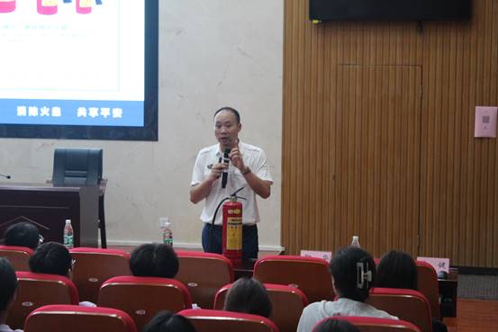 湘安消防公益中心主任林健对新生进行消防安全知识培训。他结合大量真实发生、触目惊心的案例向同学们强调了消防安全的重要性。他亲自示范防毒面具和灭火器的使用操作,指导同学们掌握实验室突发火情的应急逃生方法,提醒同学们牢固树立安全意识,预防为主,真正遇到险情的时候也要做到充分利用所学知识自救。