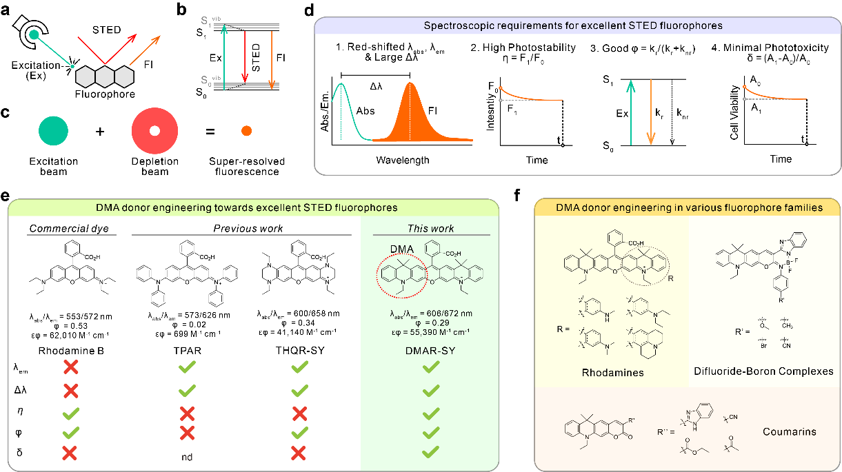 超分辨成像技术打破了光学显微镜的衍射极限,提供了卓越的时空分辨率。在各种超分辨率成像技术中,受激发射损耗纳米显微镜(STED)作为研究活细胞动态的重要工具之一,损耗激光的功率高达数GW/cm2。因此,在活细胞中进行长时间STED成像需要荧光物质同时具备优异的光稳定性,极小的光毒性,长波长(>650 nm),高亮度大Stokes位移等特性。然而,现有荧光染料很少能同时具备这些性质。