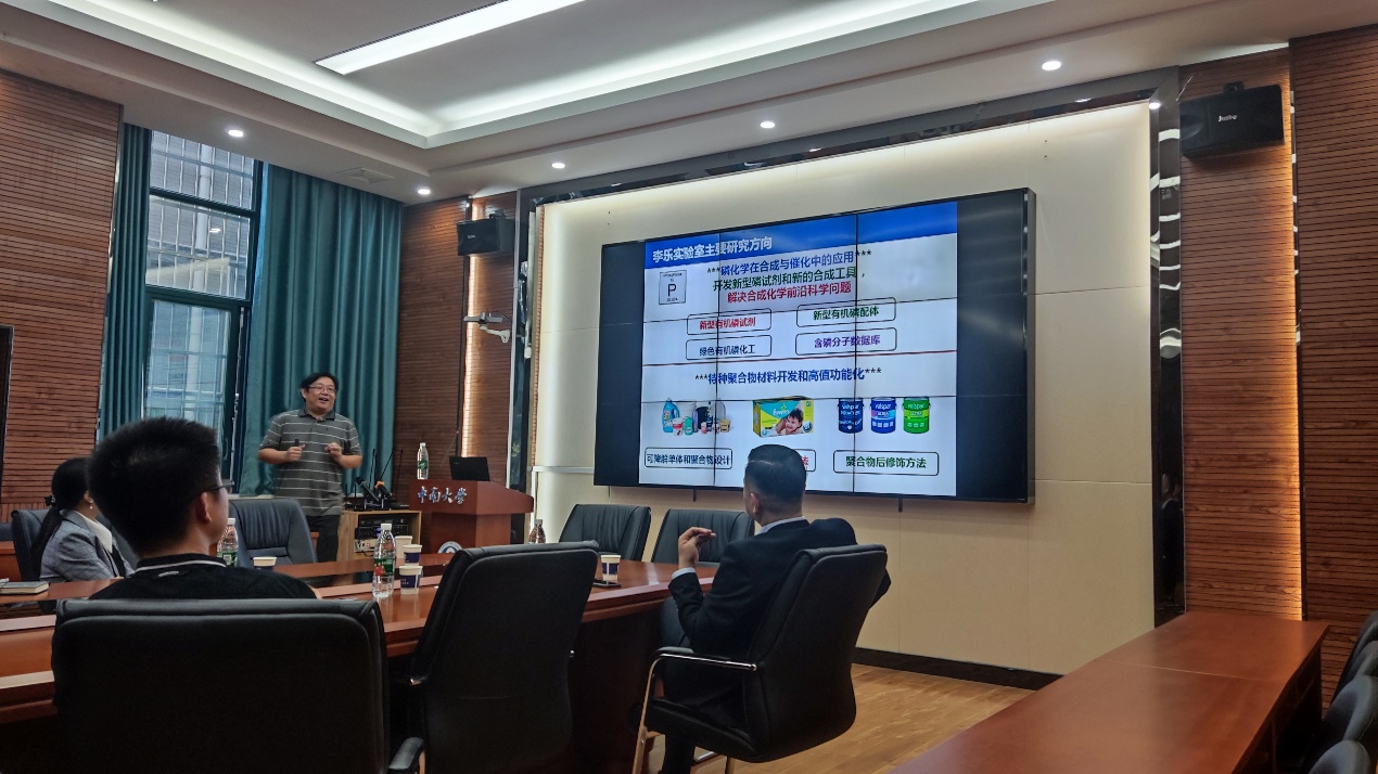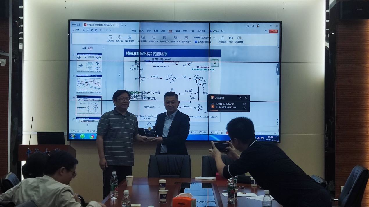 讲座接近尾声,公司老师向李乐教授请教在合成共聚物时机理如果和医学知识相关,能不能避开已发表的专利,李老师回答是可以避开的,找到新的适合课题组自主研发的新路径;也有同学问到关于三苯基磷氧磷硫的还原机理是否有实验支持,李乐教授给出了肯定的答复,同时也详细介绍了实验所用的思想。为感谢李乐教授,阳华教授为李老师送上了公司的名师讲堂纪念奖杯。