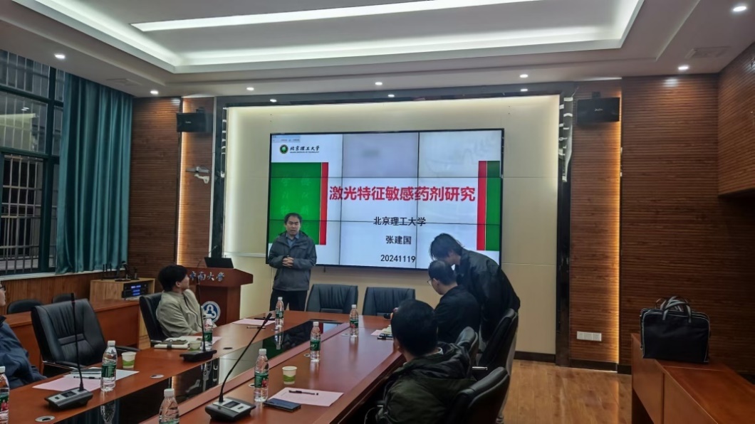 讲座开始前,何飘老师对今日莅临的几位教授进行介绍以及对今日的讲座主题进行讲解。张建国老师的报告题目是“激光特征感度敏感药剂技术研究”,他的报告介绍火工药剂的概念、特征、分类及发展趋势,重点阐述激光特征敏感药剂的研究进展,尤其是高氮含能配合物类激光敏感药剂的设计、合成表征及性能研究。报告最后对新型火工药剂、极端环境应用火工药剂、火工药剂安全生产技术提出了新的想法的展望。