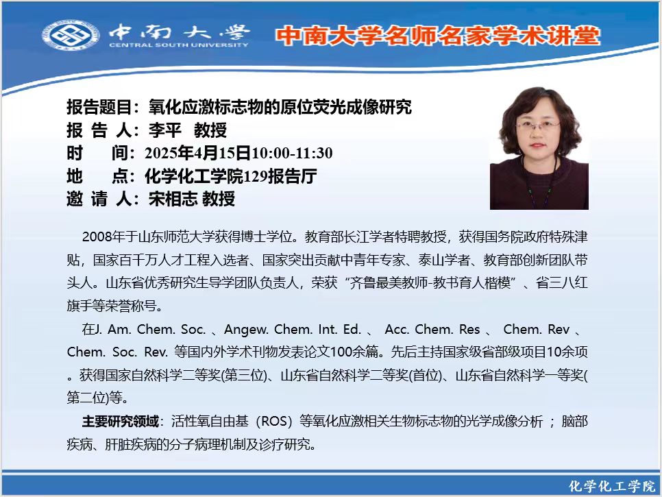 报告题目:氧化应激标志物的原位荧光成像研究 报 告 人:李平 教授 时 间: 2025年4月15日10:00-11:30 地 点: 伟德victor1946官网登录129报告厅