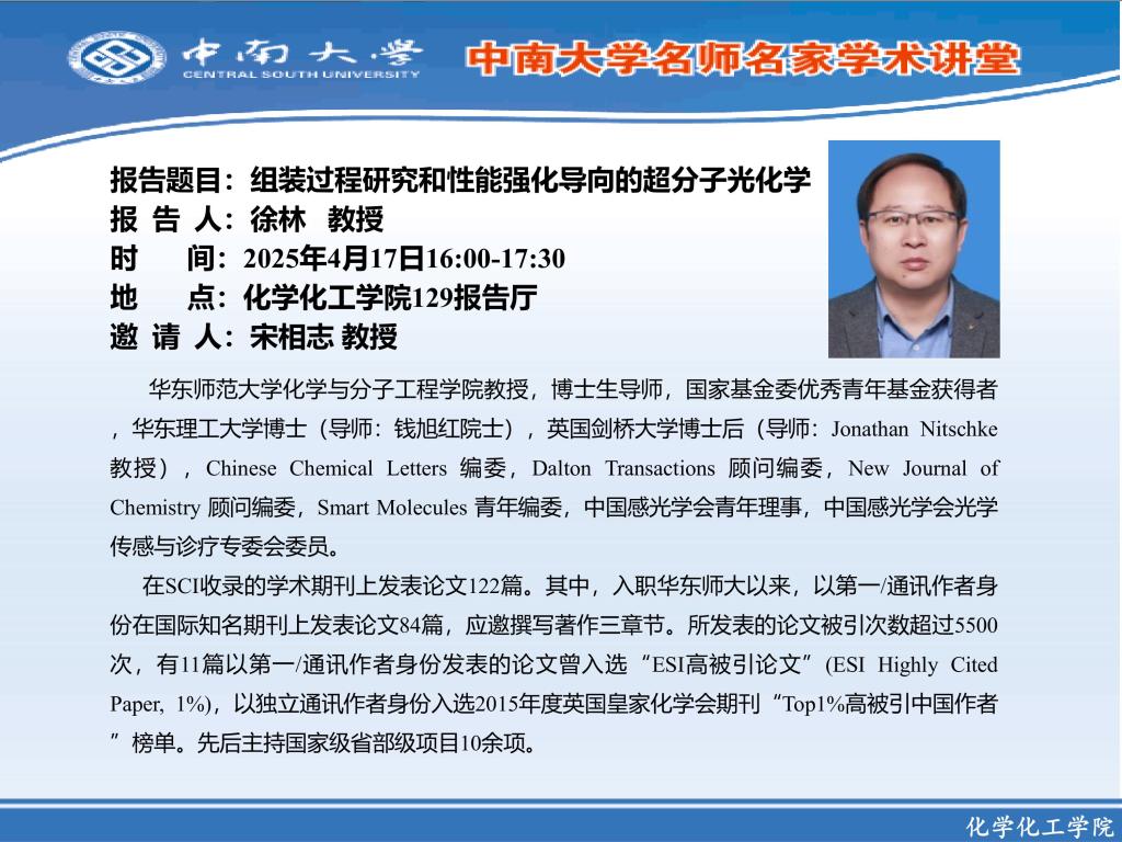 报告题目:组装过程研究和性能强化导向的超分子光化学 报 告 人:徐林 教授 时 间: 2025年4月17日16:00-17:30 地 点: 伟德victor1946官网登录129报告厅