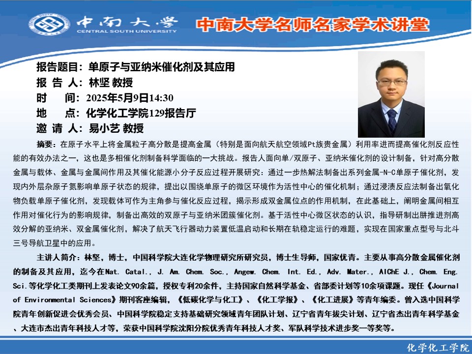 报告题目:单原子与亚纳米催化剂及其应用 报 告 人:林坚教授 时 间: 2025年5月9日(周五)14:30 地 点: 伟德victor1946官网新校区化学楼129会议室