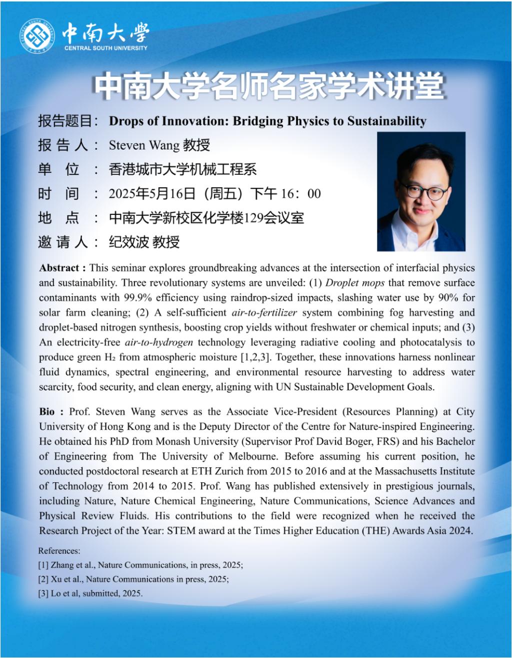 报告题目:Drops of Innovation: Bridging Physics to Sustainability 报 告 人:Steven Wang 教授香港城市大学机械工程系 时 间: 2025年5月16日(周五)下午16:00 地 点: 2025年5月16日(周五)下午16:00
