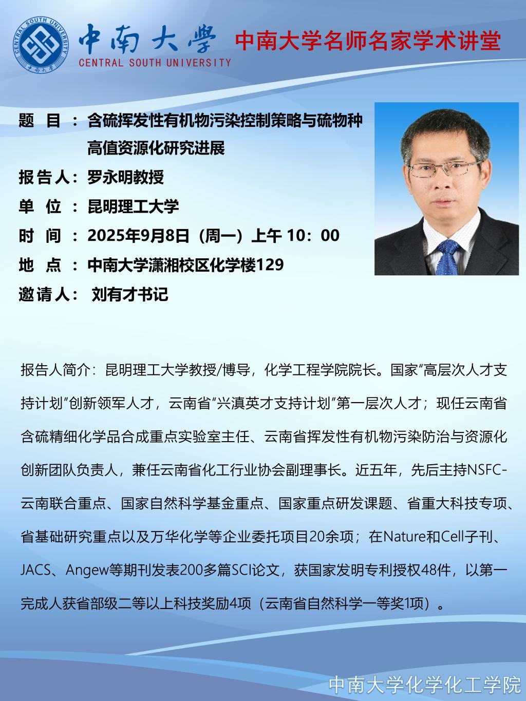 报告题目:含硫挥发性有机物污染控制策略与硫物种高值资源化研究进展 报 告 人:罗永明教授 昆明理工大学 时 间: 2025年9月8日(周一)上午 10:00 地 点: 伟德victor1946官网潇湘校区化学楼129