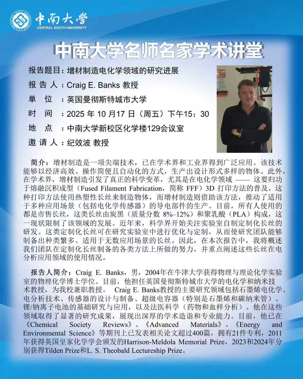 报告题目:增材制造电化学领域的研究进展 报 告 人:Craig E.Banks 教授 时 间: 2025年10月17日(周五)2025年10月17日(周五)下午15:30下午15:30 地 点: 伟德victor1946官网新校区化学楼129会议室