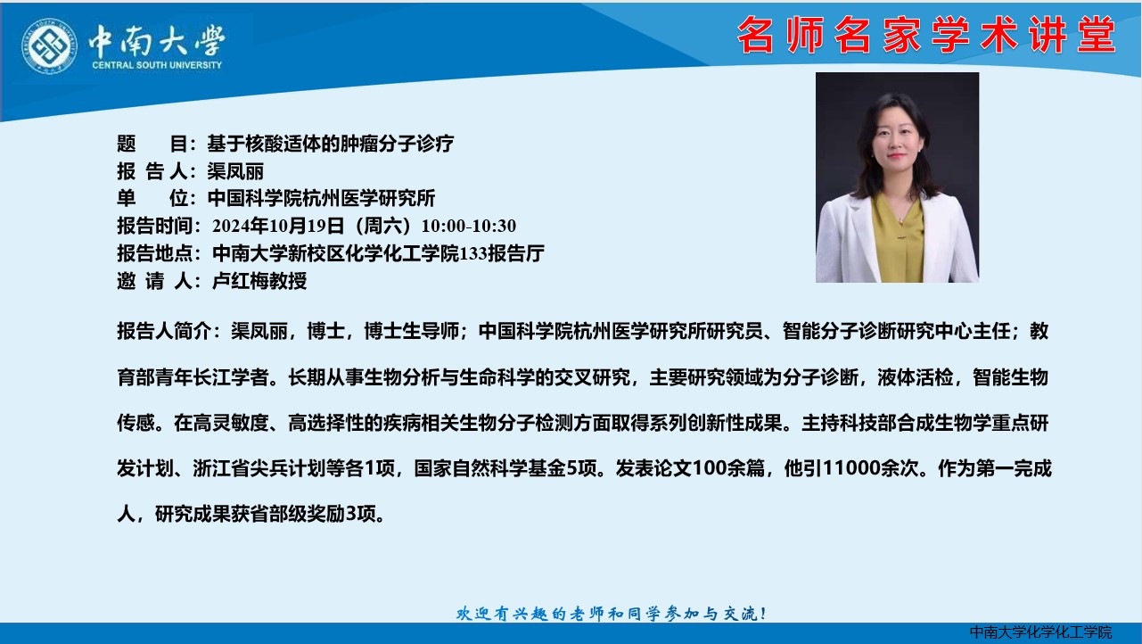 报告题目:基于核酸适体的肿瘤分子诊疗 报 告 人:渠凤丽 中国科公司杭州医学研究所 时 间: 2024年10月19日(周六)10:00-10:30 地 点: 伟德victor1946官网新校区伟德victor1946官网登录133报告厅
