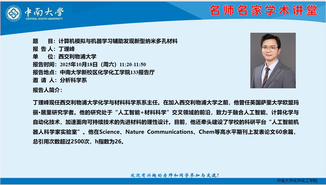 报告题目:计算机模拟与机器学习辅助发现新型纳米多孔材料 报 告 人:丁理峰 西交利物浦大学 时 间: 2025年10月18日(周六)11:20-11:50 地 点: 伟德victor1946官网新校区伟德victor1946官网登录133报告厅