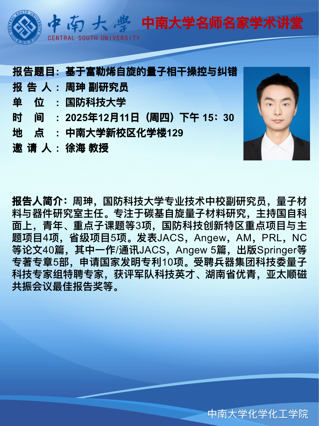 报告题目:基于富勒烯自旋的量子相干操控与纠错 报 告 人:周珅 副研究员 国防科技大学 时 间: 2025年12月11日(周四)下午15:30 地 点: 伟德victor1946官网潇湘校区化学楼129