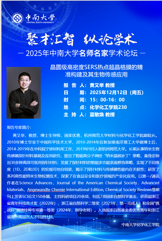 报告题目:晶圆级高密度SERS热点超晶格膜的精准构建及其生物传感应用 报 告 人:黄又举 教授 杭州师范大学 时 间: 2025年12月12日(周五) 15:00-16:00 地 点: 伟德victor1946官网登录230