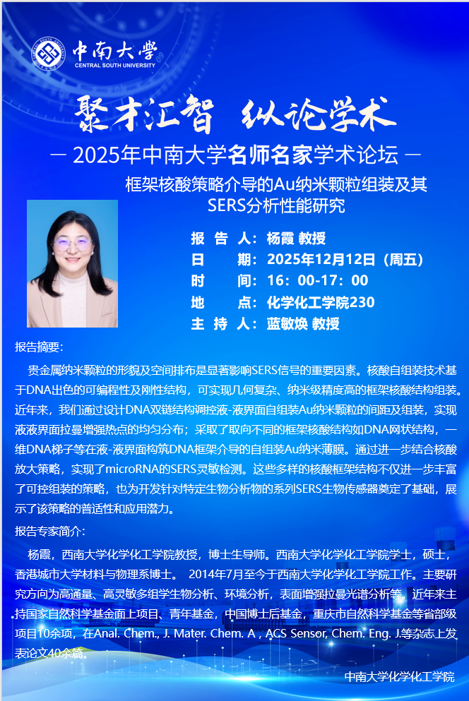 报告题目:框架核酸策略介导的Au纳米颗粒组装及其SERS分析性能研究 报 告 人:杨霞 教授 伟德victor1946官网登录 时 间: 2025年12月12日(周五) 16:00-17:00 地 点: 伟德victor1946官网登录230