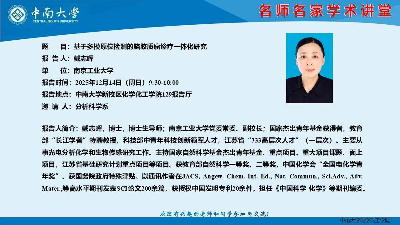 报告题目:基于多模原位检测的脑胶质瘤诊疗一体化研究 报 告 人:戴志晖 南京工业大学 时 间: 2025年12月14日(周日)9:30-10:00 地 点: 伟德victor1946官网新校区伟德victor1946官网登录129报告厅