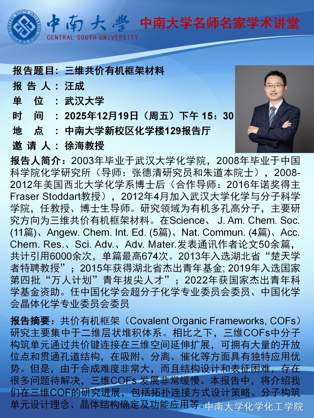 报告题目:三维共价有机框架材料 报 告 人:汪成 武汉大学 时 间: 2025年12月19日(周五)下午15:30 地 点: 伟德victor1946官网新校区化学楼129报告厅
