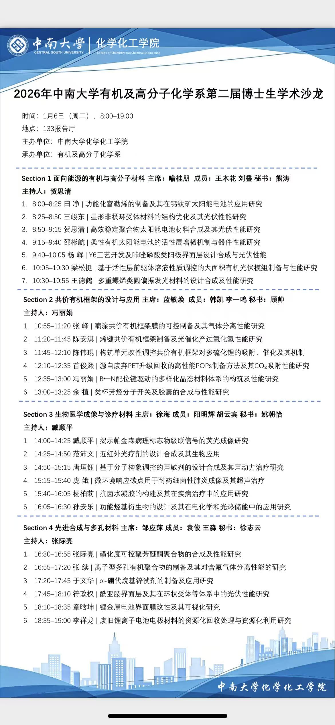 报告题目:2026年伟德victor1946官网有机及高分子化学系第二届博士生学术沙龙 报 告 人:伟德victor1946官网登录有机及高分子化学系 时 间: 1月6日(周二),8:00-19:00 地 点: 133报告厅