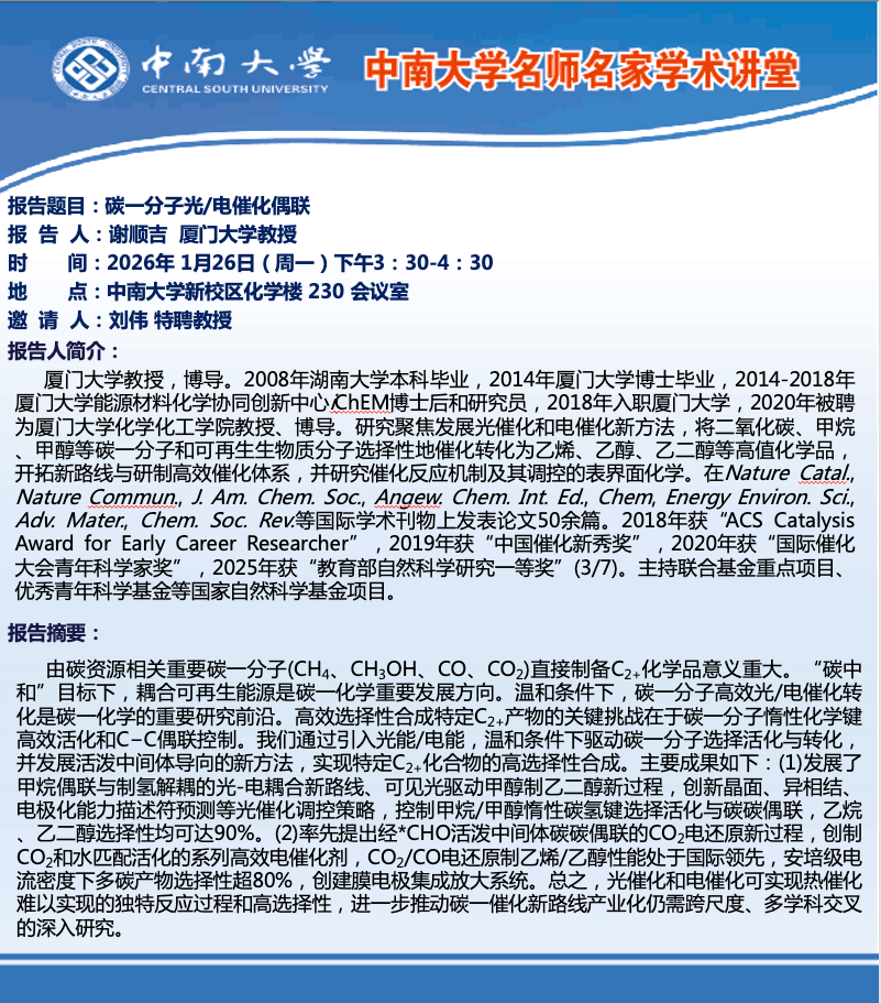 报告题目:碳一分子光/电催化偶联 报 告 人:谢顺吉厦门大学教授 时 间: 2026年1月26日(周一)下午3:30-4:30 地 点: 伟德victor1946官网新校区化学楼 230会议室