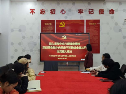 会议第二项,由支部刘静颖同志带领学习中央八项规定精神及其最新部署要求,深刻领会党中央坚定不移推进全面从严治党的坚强决心和深远意义。会议强调,中央八项规定是长期有效的铁规矩、硬杠杠,必须常抓不懈、久久为功。全体党员要深刻认识全面从严治党是党永葆生机活力、走好新的赶考之路的必由之路,必须始终保持清醒头脑,不断增强纪律意识、规矩意识,自觉抵制歪风邪气,弘扬清风正气,将严的基调、严的措施、严的氛围长期坚持下去,以优良作风保障学习和科研工作扎实开展。
