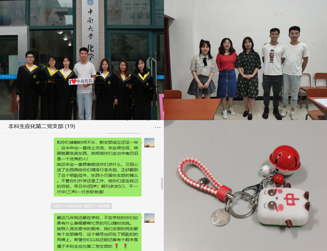 赵元超同志代表支部为毕业生党员赠送了定制钥匙挂件作为纪念,留份支部的情义,并和毕业生党员合照留念。毕业生党员纷纷表示,从支部成立至今,在党支部中成长收获了很多,支部的温暖会一直铭记在心,并在未来的学习工作生活中,踏实做事,做有能力、有担当的青年。