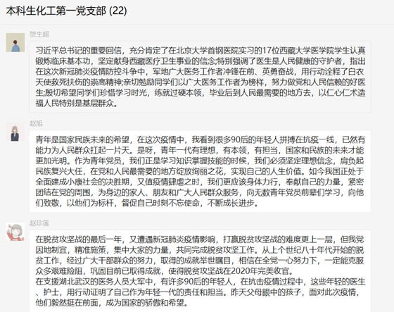 在谈到习总书记给西藏大学医公司员工、北京大学援鄂医疗队回信的时候,赵旭同志认为:“作为青年党员,我们正是学习知识掌握技能的时候,我们必须坚定理想信念,肩负起民族复兴大任,在党和人民最需要的地方绽放绚丽之花,实现自己的人生价值。如今我国正处于全面建成小康社会的决胜期,又值疫情肆虐之时,我们更应该身体力行,奉献自己的力量,紧密团结在党的周围,为身边的家人、朋友和广大人民群众服务,向无数青年党员前辈们学习,向他们致敬,以他们为标杆,督促自己时刻不忘使命,不断成长进步。”
