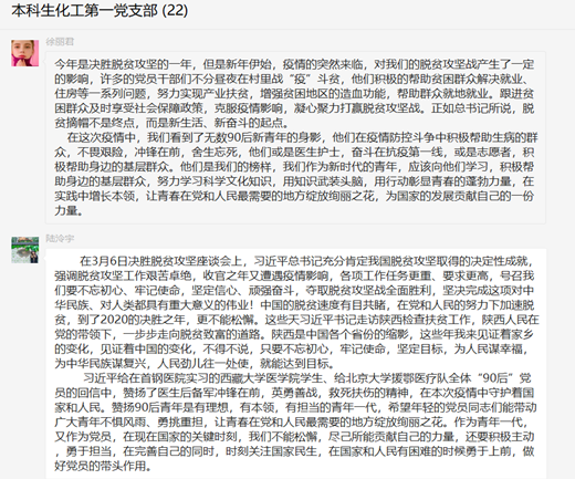 4月25日下午,本科生化工第一党支部召开4月份组织生活会,会议围绕习近平总书记在决胜脱贫攻坚战座谈会上的讲话、习总书记给西藏大学医公司员工及北京大学援鄂医疗队回信等方面开展学习。会议由支部副书记孙金宇同志主持,支部全体党员参加。