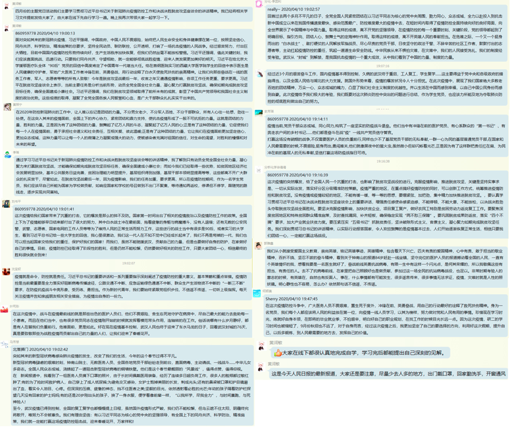 随后,支部同志在支部群里就习近平总书记近期重要讲话精神及疫情防控工作开展了激烈的讨论,并分享了自己的深刻体会。同志们一致认为,在疫情面前钟南山院士坐镇一线、广大医务人员不畏艰难冲锋在前、各地防疫一线人员和全国各地党员干部勇往直前、主动请战,时刻将人民的利益放在第一位,彰显了他们不畏牺牲的爱国主义精神,同时体现了我们中华民族勠力同心、众志成城的凝聚力和团结精神,凸显了我们社会主义制度的优越性。何顺美同志表示,因为这次疫情,研二的学习时间也被缩短了。面对9月份的秋招,她更加坚定了自己的要选择的方向,希望到人民最需要的地方去,发挥自己的价值。并表示要珍惜现在学习时光,练就好自身本领,提升自己。