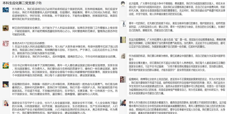 2020年4月17日晚九点,本科生应化第二党支部通过腾讯会议、微信群举行线上党日活动,进一步学习习近平总书记近期重要讲话精神,并就国家安全进行学习。会议由支部书记赵元超同志主持,支部全体党员参加。
