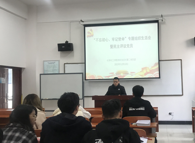 2019年12月10日中午12:40,本科生应化第二党支部在新校区化学楼123教室召开了“不忘初心、牢记使命”专题组织生活会暨民主评议党员大会。本次会议由支部书记赵元超同志主持,联系支部的伟德victor1946官网登录党委委员、组织员李璞同志到会指导。本次大会还邀请了6名群众参加。