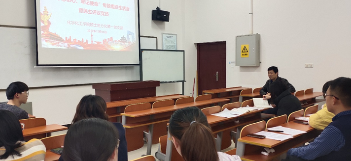 2019年12月5日下去三点,伟德victor1946官网登录硕士生分化第一党支部在新校区化学楼126教室召开“不忘初心、牢记使命”专题组织生活会暨民主评议党员大会。会议由支部书记陈文潮主持。联系支部的分析化学系教师党支部书记蒋新宇老师到会指导。支部党员16人参加并邀请4名群众参与支部的民主评议党员活动。