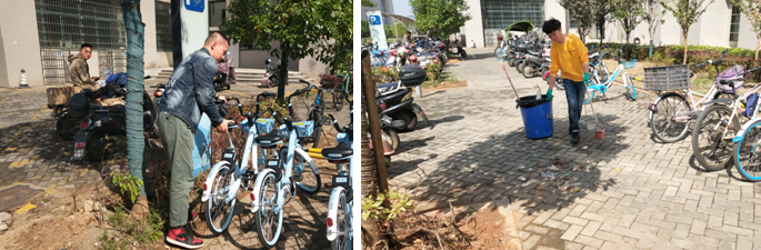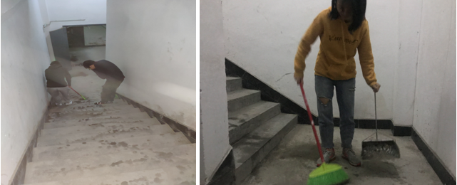 志愿活动中,同志们将停放混乱的自行车、电动车摆放整齐;将化院前坪草丛中的上的纸屑,塑料盒等垃圾清理干净。楼梯间里灰尘已经积累了很多,但即便打扫起来尘土飞扬令人难以呼吸同志们也一丝不苟地“撸起袖子加油干”。