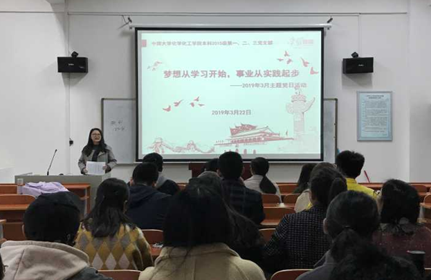 3月22日下午,本科2015级第一、二、三党支部在新化学楼128教室成功开展了以“梦想从学习开始,事业从实践起步”为主题的党日活动。本次党日活动主要内容为学习贯彻《中共中央关于加强党的政治建设的意见》《中国共产党重大事项请示报告条例》、2019年全国“两会”精神和全省教育大会精神。
