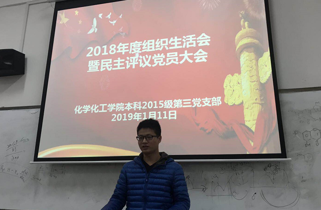 2019年1月11日下午3点,本科2015级第三党支部在新校区化学楼123教室召开2018年度组织生活会暨民主评议党员大会。支部全体党员参加,联系教职工党员钟世安老师到会指导并点评,会议由支部书记杨宵同志主持。