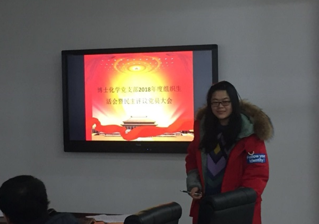 2019年1月11日下午3点,博士化学党支部于化学楼203召开2018年度组织生活会暨民主评议党员大会。会议应到党员38名,实到30名,何庭,胡芳两位同志公派留学出国未归,黄小燕、言文远、刘维芳、吴玲、刘晔以及潘成迟六位同志校外联培无法到场,但都通过语音或视频方式参与了会议。会议由支部书记郝佳瑜同志主持,滕晓雯老师作为联系教职工党员到会对支部工作进行了指导并作点评。