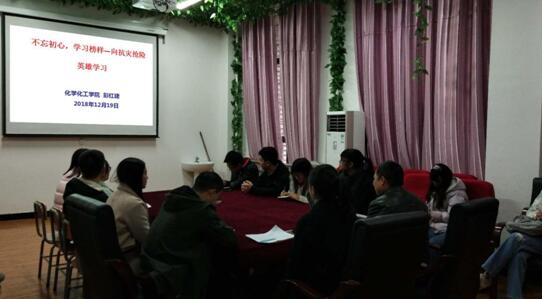 为认真学习贯彻习近平总书记重要讲话精神,落实上级党组织相关文件要求,广泛开展向黄群、宋月才、姜开斌同志为代表的抗灾抢险英雄群体和王继才同志学习。有机化学系党支部书记彭红建同志于2018年12月19日在132党员活动室,为2018级联合党支部开展了“不忘初心,学习榜样—向抗灾抢险英雄学习”的党课教育。
