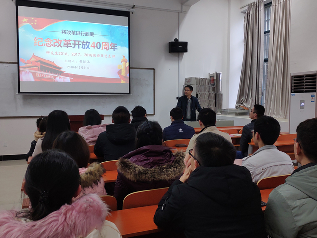 2018年12月18日,习近平总书记在庆祝改革开放40周年大会上发表了重要讲话,为深入贯彻落实党的十九大精神和“两学一做”学习教育常态化制度化,12月21日下午14:30,在新校区化学楼123教室,应化系党支部书记黄健涵老师为所联系的研究生2016级、2017级、2018级应化党支部主讲《纪念改革开放40周年》专题党课。党课由研究生2017级应化党支部书记何海传主持,研究生应化专业三个支部全体党员参加学习。