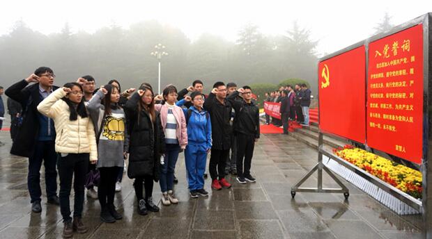 天气阴雨绵绵,但同学们热情不减,经过了一个多小时的车程,同学们抵达了刘少奇纪念馆,下车以后,首先映入眼帘的就是高达七米的刘少奇同志的铜像,在铜像广场下面对鲜红的党旗与入党誓词,支部预备党员再次庄严宣读誓词,重温誓词让同学们回首成为预备党员以来对于党的奉献与收获,也时刻提醒着大家作为党员应有的使命与职责。