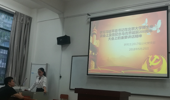 2018年5月25日,研究生2017级分化党支部在新化学楼124召开了支部党员大会,认真学习了习近平总书记在北京大学师生座谈会上及纪念马克思诞辰200周年大会上的重要讲话精神,并组织开展了专题研讨,随后观看纪录片《厉害了,我的国》。