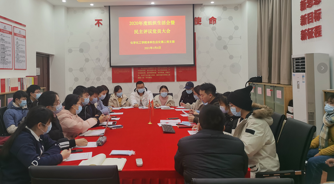 2021年1月6日下午,本科生应化第二党支部在新校区化学楼132党员活动室召开了2020年度组织生活会暨民主评议党员大会。本次会议由支部书记赵元超同志主持,支部全体党员同志参会,联系支部的党委委员李璞同志列席指导。此外本次大会还邀请了2名入党积极分子列席参加。
