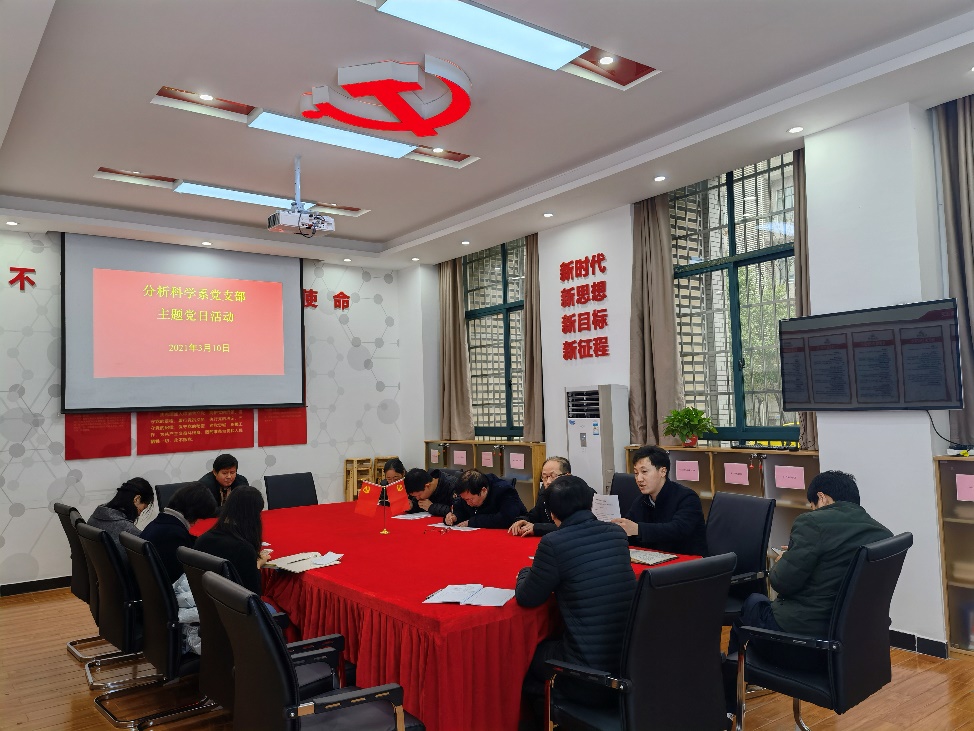 3月10日下午,分析科学系全体党员在化学楼132会议室开展党史学习教育和师德专题教育活动。支部书记于金刚同志主持专题学习会。